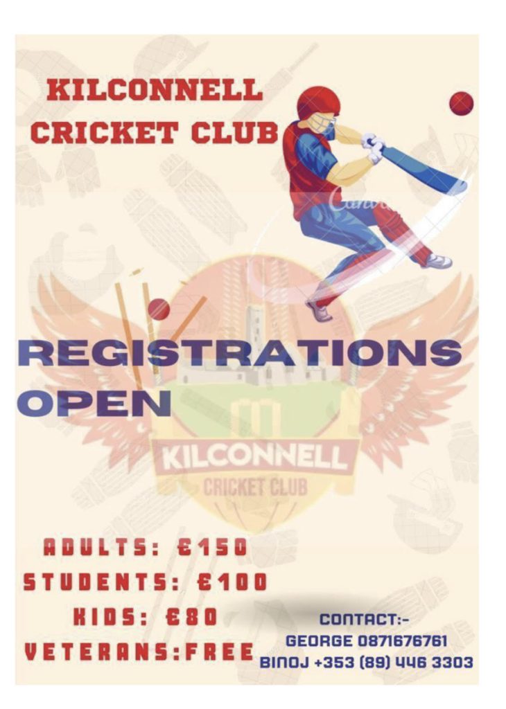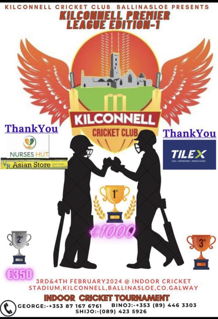 ഈ വര്ഷം മുതല് Kilconnell Community Park-ലെ ഗ്രൗണ്ടില് Ballinasloe Cricket Club-ന്റെ നേതൃത്വത്തില് ടൂര്ണ്ണമെന്റുകള് നടത്താനൊരുങ്ങുകയാണ് ക്ലബ്ബ് അധികൃതര്. ഫ്രെഷേഴ്സ്, സീസണ് കളിക്കാര് തുടങ്ങി ക്രിക്കറ്റില് തല്പ്പരരായ എല്ലാവരെയും ക്ലബ്ബില് അംഗങ്ങളാകാന് ക്ഷണിക്കുന്നതായി സംഘാടകര് അറിയിച്ചു.