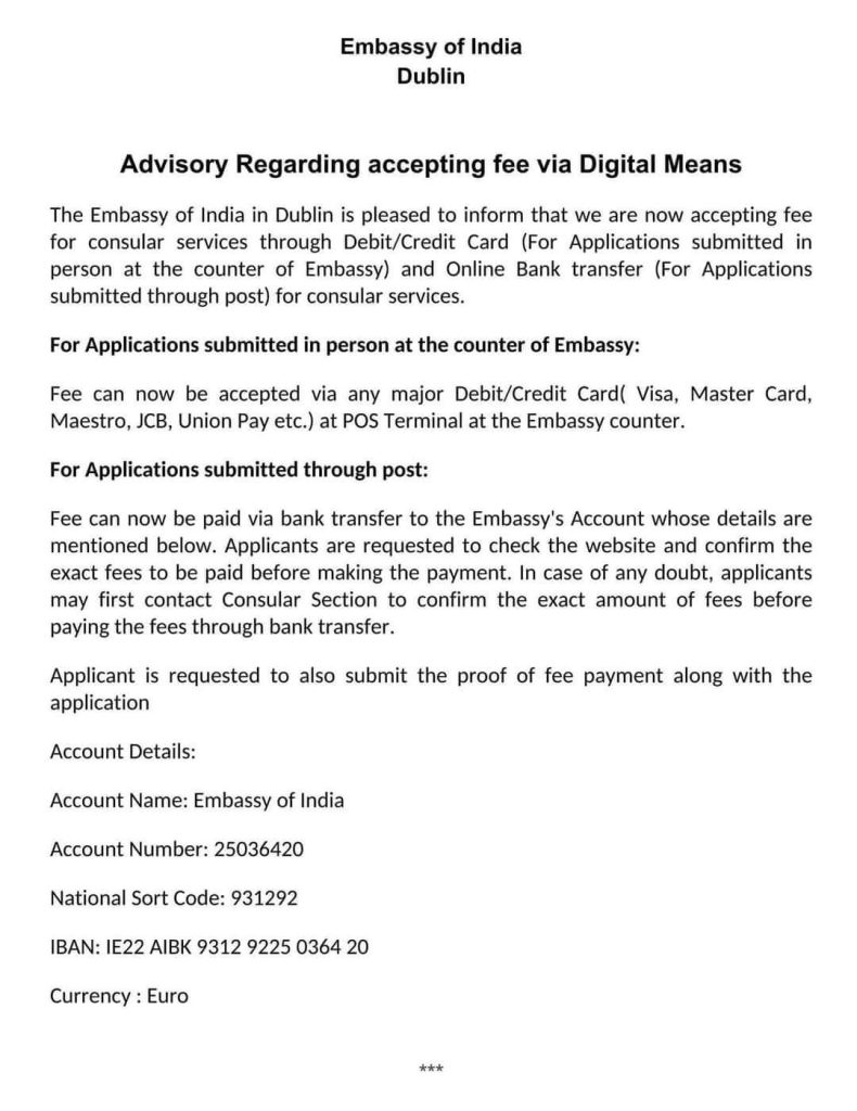 പോസ്റ്റല് വഴി അപേക്ഷ അയയ്ക്കുകയാണെങ്കില് പ്രസ്തുത സേവനത്തിന് അടയ്ക്കേണ്ടുന്ന ഫീസ് എംബസി വെബ്സൈറ്റ് നോക്കി ഉറപ്പ് വരുത്തയതിന് ശേഷം എംബസിയുടെ അക്കൗണ്ടിലേയ്ക്ക് പണം ട്രാന്സ്ഫര് ചെയ്യാം. ഫീസിന്റെ കാര്യത്തില് സംശയങ്ങളുണ്ടെങ്കില് പണം അടയ്ക്കുന്നതിന് മുമ്പായി കോണ്സുലാര് സെക്ഷനില് നേരിട്ട് വിളിച്ച് വ്യക്തത വരുത്തണം. ശേഷം അപേക്ഷയ്ക്കൊപ്പം ഫീസ് അടച്ചതിന്റെ പ്രൂഫും അയയ്ക്കണം.