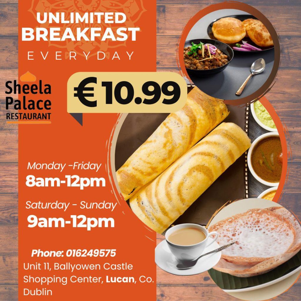 അയർലണ്ടിന്റെ ചരിത്രത്തിൽ ആദ്യമായി ആഴ്ചയിൽ എല്ലാ ദിവസവും ഇന്ത്യൻ ബ്രേക്ഫാസ്റ്റ് ലഭിക്കുന്ന റസ്റ്ററന്റായി ലൂക്കനിലെ ഷീലാ പാലസ്. ഇന്ന് മുതൽ (മാർച്ച് 20) ഈ സൗകര്യം ലഭ്യമാണ്.