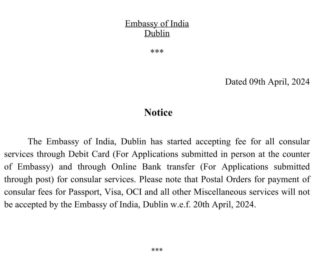 എംബസിയില് നേരിട്ടെത്തി സമര്പ്പിക്കുന്ന എല്ലാ കോണ്സുലാര് അപേക്ഷകളുടെയും ഫീസ്, ഡെബിറ്റ് കാര്ഡുകള് വഴി സ്വീകരിക്കാന് ആരംഭിച്ചതായി ഡബ്ലിനിലെ ഇന്ത്യന് എംബസി. ഒപ്പം പോസ്റ്റല് വഴിയുള്ള അപേക്ഷകളുടെ ഫീസ് ബാങ്ക് ട്രാന്സ്ഫര് വഴിയും സ്വീകരിച്ചുതുടങ്ങി.