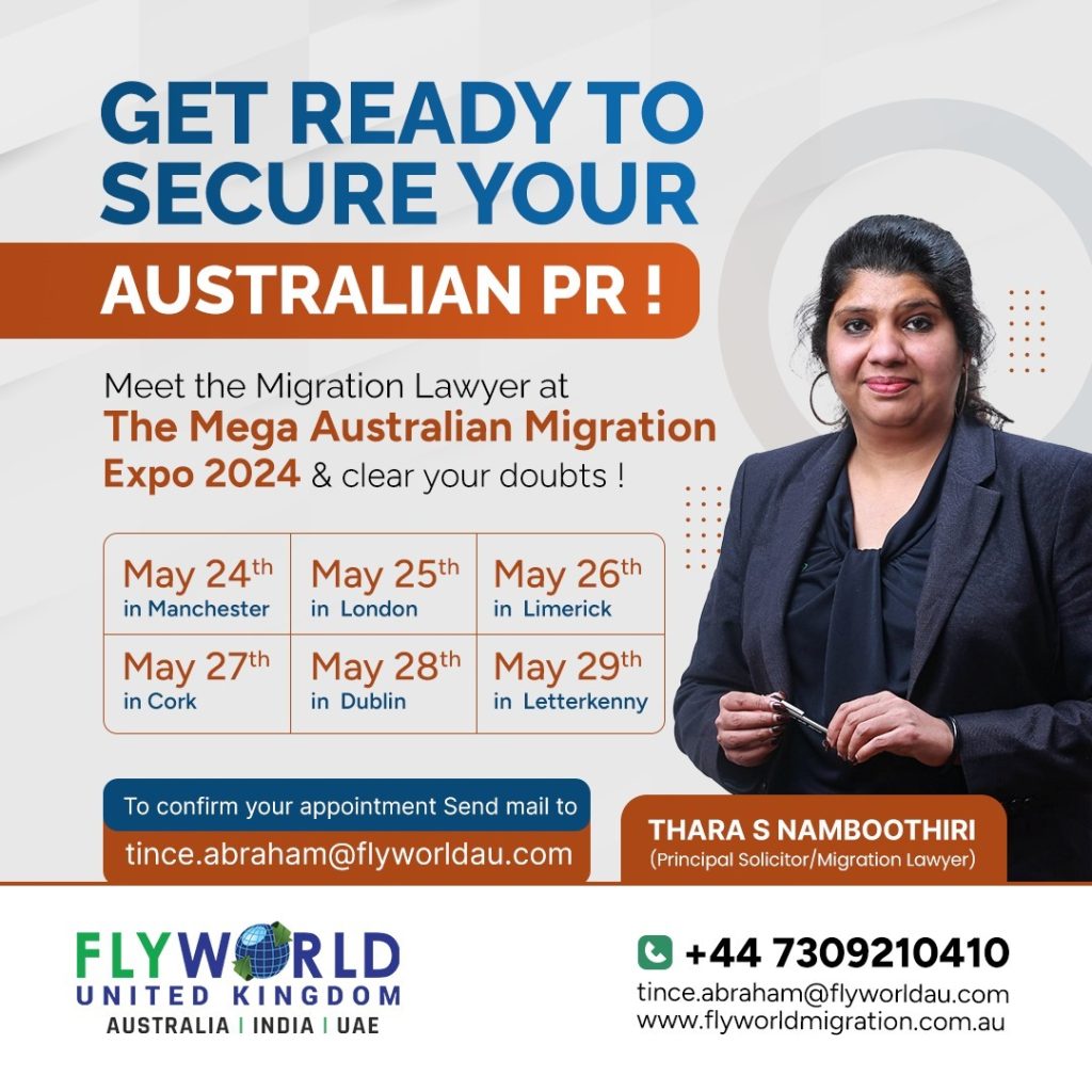 ഓസ്ട്രേലിയയിലേക്ക് മൈഗ്രേറ്റ് ചെയ്യാൻ യോഗ്യരായവർക്ക് ഏറ്റവും മികച്ച ഒരു അവസരം ഒരുക്കുകയാണ് ഫ്ലൈ വേൾഡ് എക്സ്പോയിലൂടെ. പ്രവേശനം തികച്ചും സൗജന്യമായ ഈ എക്സ്പോയിൽ നിങ്ങൾക്ക് മൈഗ്രേഷൻ ലോയറോട് നേരിട്ട് സംശയങ്ങൾ ചോദിച്ച് മനസ്സിലാക്കാനുള്ള അവസരം ഉണ്ടായിരിക്കുന്നതാണ്. സ്കിൽഡ് പ്രൊഫഷനൻസിന് ഓസ്ട്രേലിയയിൽ സാധ്യമായ തൊഴിലവസരങ്ങളെക്കുറിച്ചും പി ആർ കരസ്ഥമാക്കാനുള്ള എളുപ്പവഴികളെക്കുറിച്ചും താര എസ് നമ്പൂതിരി ജനങ്ങളോട് നേരിട്ട് സംവദിക്കുന്നതായിരിക്കും.