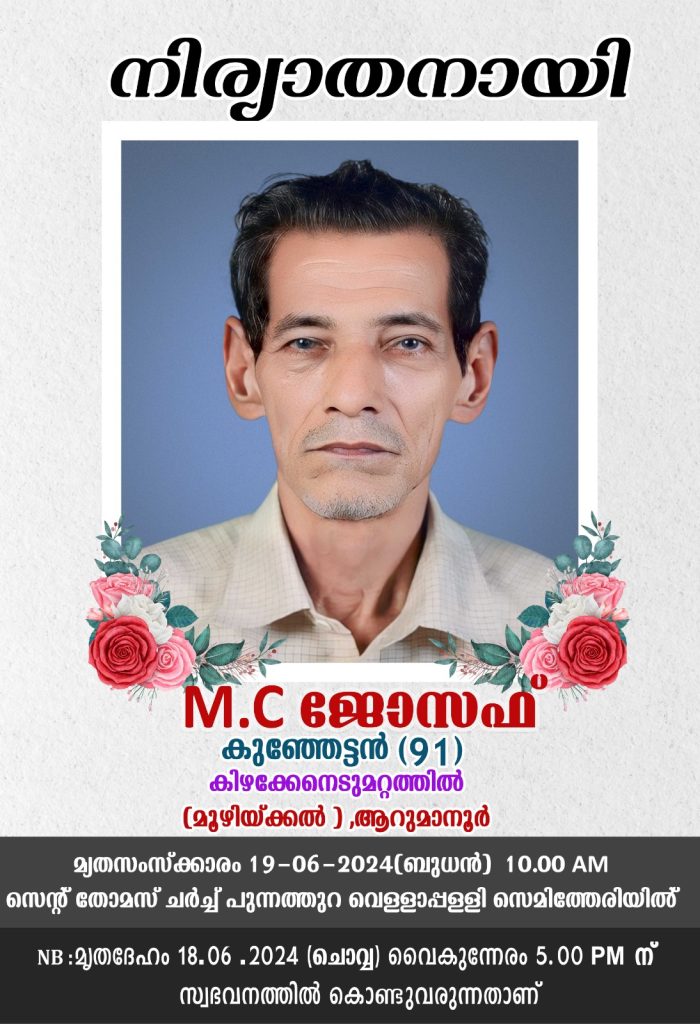 സ്ലൈഗോ, അയർലൻഡ് /കോട്ടയം: സ്ലൈഗോയിലെ സന്തോഷിന്റെ പിതാവ് മൂഴിക്കൽ കിഴക്കേ നെടുമറ്റത്തിൽ എം.സി ജോസഫ് (91) നിര്യാതനായി. പരേതയായ ത്രേസ്യമ്മ ഭാര്യയാണ്.