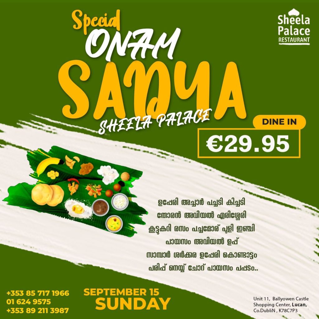 ഈ തിരുവോണത്തിനു ഇല നിറയെ വിഭവങ്ങളുമായി ഒരുഗ്രൻ സദ്യ ആയാലോ? മലയാളികളുടെ പ്രിയപ്പെട്ട ഷീലാ പാലസ് റസ്റ്ററന്റ് ഇതാ വെറും 29.95 യൂറോയ്ക്ക് വിഭവസമൃദ്ധമായ സ്പെഷ്യൽ ഓണ സദ്യയ്ക്കായി ഡൈൻ ഇൻ സൗകര്യം ഒരുക്കിയിരിക്കുന്നു.