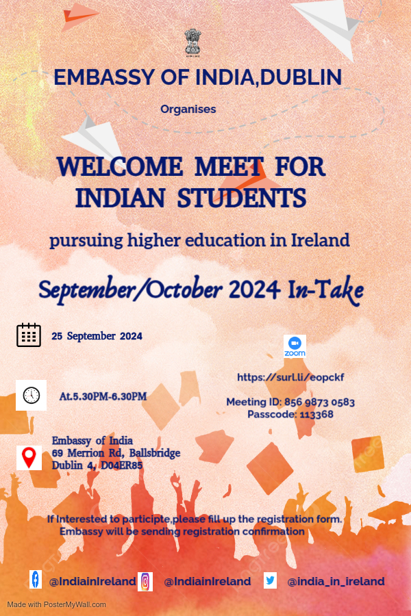 അയർലണ്ടിൽ ഉന്നത പഠനാവശ്യങ്ങൾക്ക് എത്തിയ ഇന്ത്യൻ വിദ്യാർത്ഥികളുമായി കൂടിക്കാഴ്ച ഒരുക്കി ഡബ്ലിനിലെ ഇന്ത്യൻ എംബസി. ഈ വർഷം സെപ്റ്റംബർ, ഒക്ടോബർ മാസങ്ങളിലായി അഡ്മിഷൻ എടുക്കുന്നവർക്കാണ് സെപ്റ്റംബർ 25-ന് കൂടിക്കാഴ്ച നിശ്ചയിച്ചിരിക്കുന്നത്.