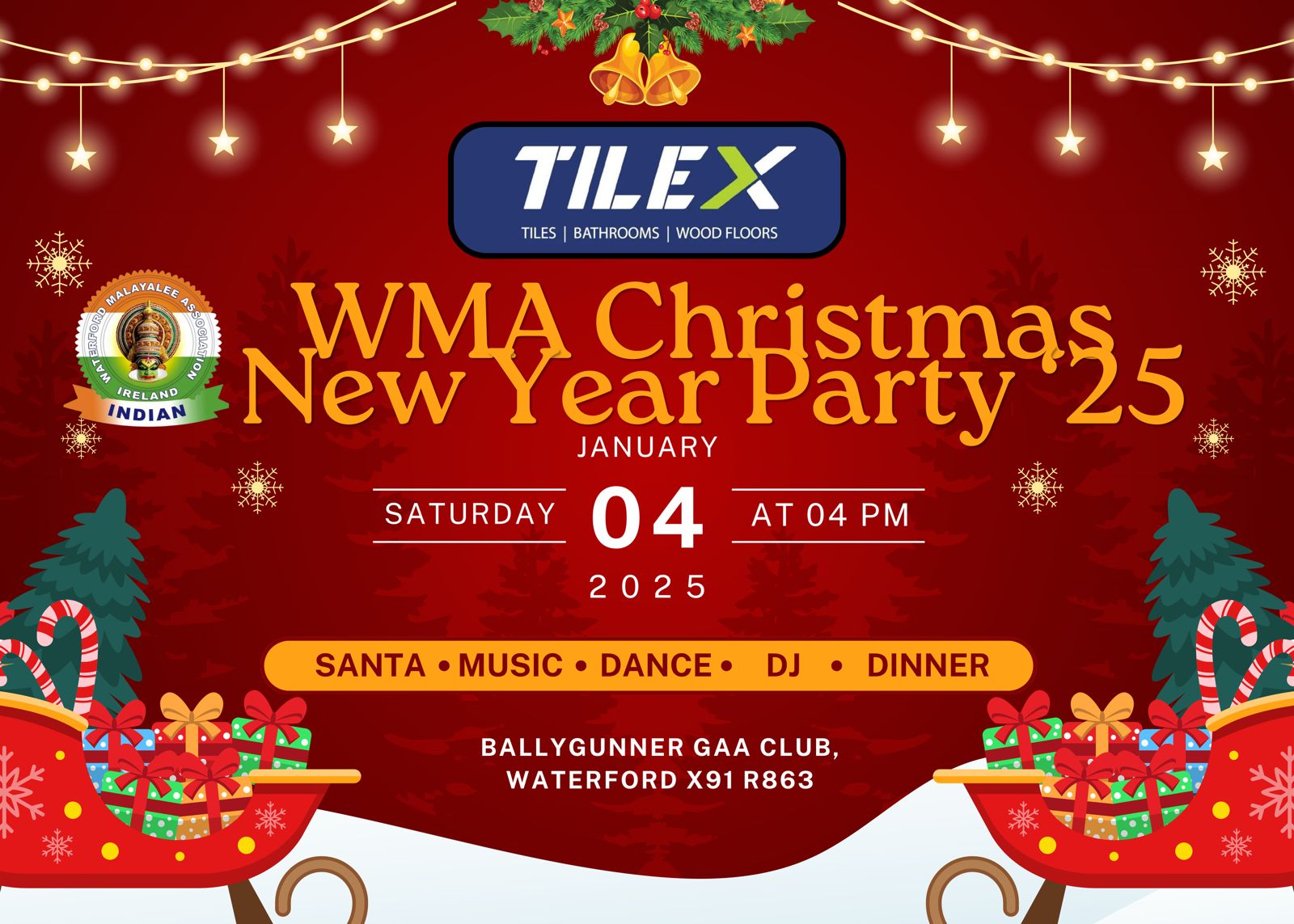വാട്ടർഫോർഡ്:വാട്ടർഫോർഡ് മലയാളി അസോസിയേഷൻറെ(WMA) ക്രിസ്മസ് പുതുവത്സരാഘോഷങ്ങളുടെ ഒരുക്കങ്ങൾ പൂർത്തിയായി. വാട്ടർഫോർഡ് ബാലിഗണർ GAA ക്ലബ് ഇൻഡോർ സ്റ്റേഡിയത്തിൽ ഇന്ന് വൈകുന്നേരം നാലുമണിക്ക് ആരംഭിക്കുന്ന പരിപാടികൾ രാത്രി പത്തു മണിയോടുകൂടി അവസാനിക്കുന്നതാണ്. വാട്ടർഫോർഡ് കൗണ്ടി മേയർ ജയ്സൺ മർഫി ആഘോഷ പരിപാടികൾ ഉദ്ഘാടനം ചെയ്യുന്നതാണ്