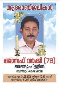 സംസ്കാരം മാർച്ച് 24, തിങ്കളാഴ്ച രാവിലെ 10.30ന് വണ്ണപ്പുറം മാർ സ്ലീവാ ടൗൺ ചർച്ചിൽ നടക്കും.