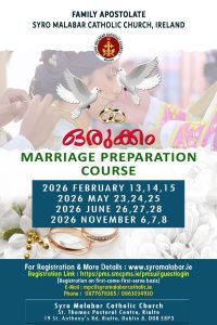 ഡബ്ലിൻ: അയർലണ്ട് സീറോ മലബാർ സഭയുടെ ഫാമിലി അപ്പസ്തോലേറ്റ് സംഘടിപ്പിക്കുന്ന വിവാഹ ഒരുക്ക സെമിനാർ ‘ഒരുക്കം,’ 2026 ഫെബ്രുവരി, മെയ്, ജൂൺ, നവംബർ മാസങ്ങളിൽ നടത്തപ്പെടും. ഈ വർഷം നടക്കാനിരിക്കുന്ന കോഴ്സുകളിലേക്കുള്ള രജിസ്ട്രേഷൻ നിലവിൽ പുരോഗമിച്ചുകൊണ്ടിരിക്കുകയാണ്.