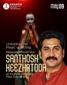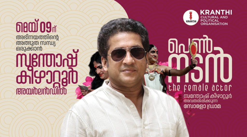 പ്രമുഖ നാടക നടനും സിനിമാതാരവുമായ സന്തോഷ് കീഴാറ്റൂർ അയർലൻഡിൽ തന്റെ പ്രസിദ്ധ നാടകമായ ‘പെൺനടൻ’ അവതരിപ്പിക്കാൻ എത്തുന്നു. ക്രാന്തി അയർലൻഡ് സംഘടിപ്പിക്കുന്ന മെയ്ദിന ആഘോഷ പരിപാടിയിലാണ് സോളോ ഡ്രാമയായി സന്തോഷ് കീഴാറ്റൂർ തന്റെ പെൺനടൻ എന്ന നാടകം അവതരിപ്പിക്കുന്നത്.